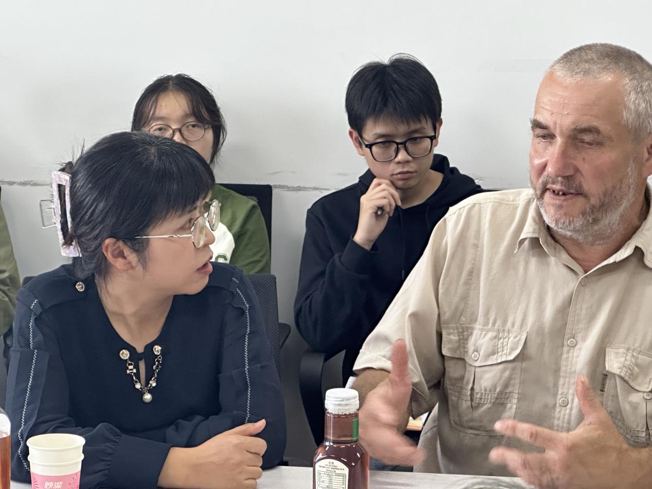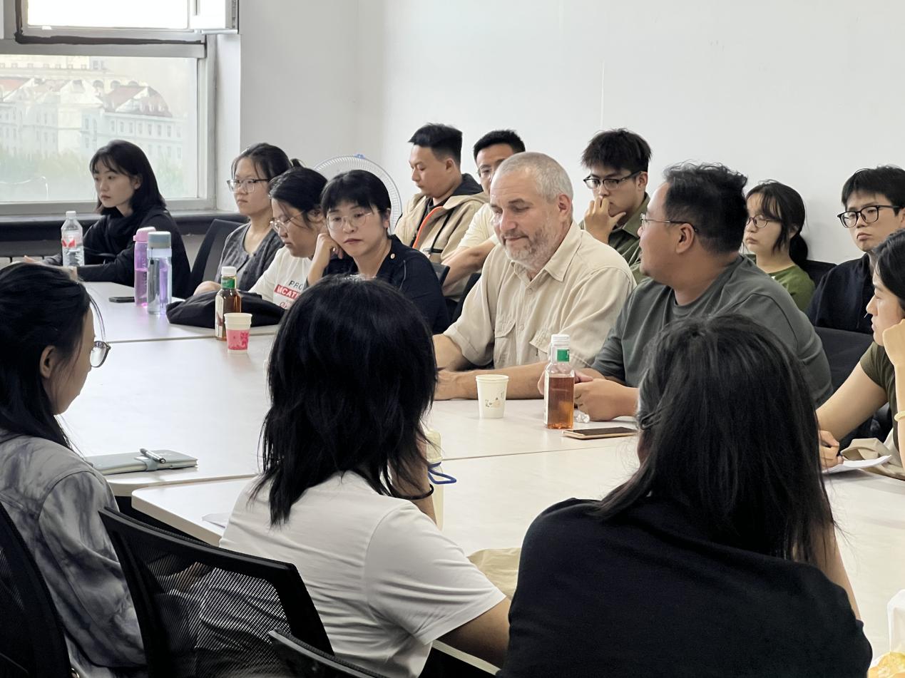 随后,我院史书副教授主持座谈会,齐甘辛研究员以“中国软实力的哲学基础”为主题,分享了其最新研究成果,我院史书副教授、刘恩帅讲师承担了部分翻译工作。齐甘辛研究员首先分享了开始研究中国软实力哲学基础的契机,指出目前国外学者仍对中国当代哲学生态有相当误解,普遍未能跟进中国当代哲学的发展进程。实际上,中国非常重视软实力哲学基础的形成,并已取得一定成果。这一基础传承自中华优秀传统文化,依托于以新时代国家领导人为核心的党组织的智慧,丰富了马克思主义哲学的视域与理论指向。