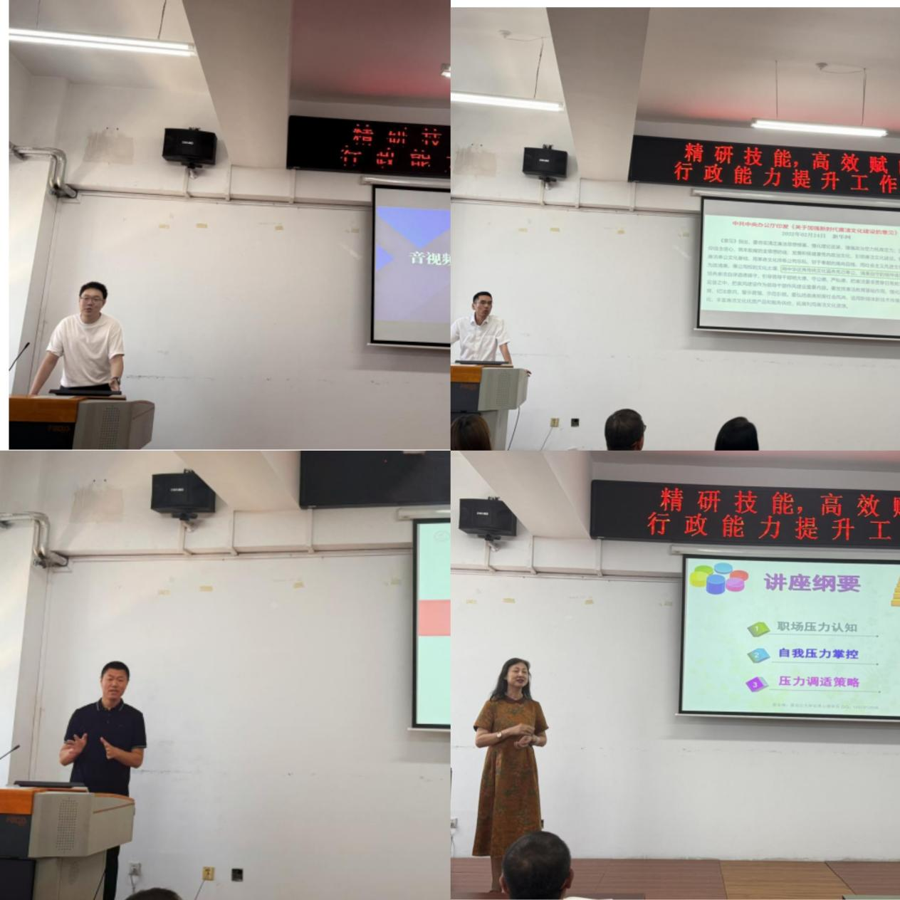 雷震老师讲述了中国传统的廉文化,期望共同做到“执纪者必先守纪,律人者必先律己”;政府管理学院付传老师讲解了怎样写好工作总结,对工作总结的每一部分的详细剖析,大家写作的质量和水平得到了切实的提高;教学科学研究院谢念湘老师现场对大家进行心理压力值测试,并分享了职场压力掌控与调适策略,会后大家纷纷表示对自身的压力状况有了更清晰的认知。