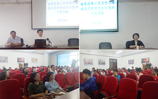 林教授首先提出儒释道融通何以可能,怎样概括儒释道的思想,现代化与现代化之后的区别,可能贡献、对比的必要性和融通的可能性以及关于话语权的问题:如何平等的交谈与对话等五个问题作为开场,引导同学们思考。随后,林教授从历史到当代通过问题讲解了儒道佛的区别与和会。林教授以图表的方式为同学们列出了一份清晰而详细的儒道佛三家在主旨、目标、身心状态、观法、修养功夫、存在论式、实践方式、人格形成等方面的不同,并进行了区分和讲解。紧接着,林教授从现代化到现代化之后结合现代化效应:工具性的合理性、人的异化、生命有机总体的失落与重建等讲解了关于存在的断裂观的反思,对比存在的连续观。最后,林教授分析了儒道佛深层反思的可能意蕴:生生不息、自如自在,指出在于思的关系是言外有知、知外有思、思外有在。最后,林教授对同学们的提问一一进行了详细解答。讲座在热烈的掌声中结束。
