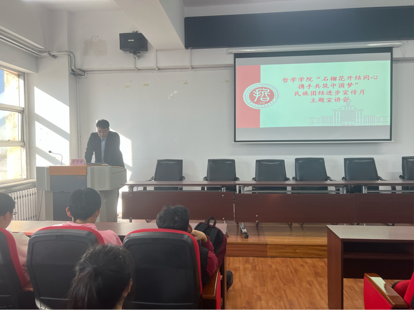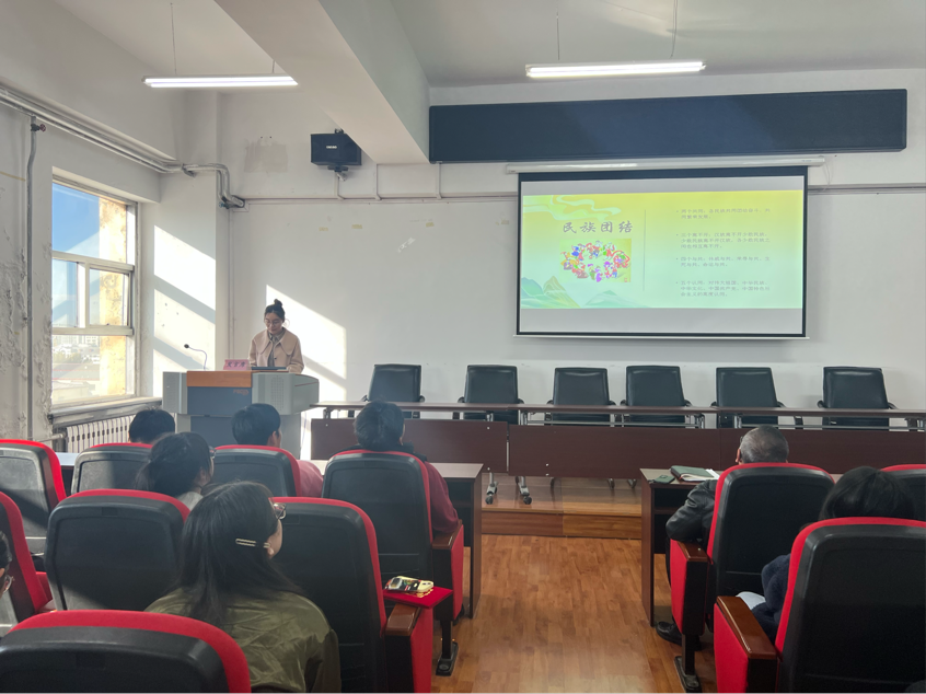 “石榴花开结同心 携手共筑中国梦”民族团结进步宣传月主题活动的通知》主要内容,对同学们提出要求和希望,要以铸牢中华民族共同体意识为主线,全面加强爱国主义和中华民族共同体意识学习。张博伦老师强调了开展“石榴花开结同心,携手共筑中国梦”民族团结进步宣传月的重要意义,要将党的二十大精神、习近平总书记关于加强和改进民族工作的重要思想、习近平总书记在黑龙江考察的重要讲话重要指示精神与学习生活紧密融合,不断增强维护民族团结进步意识与民族凝聚力。