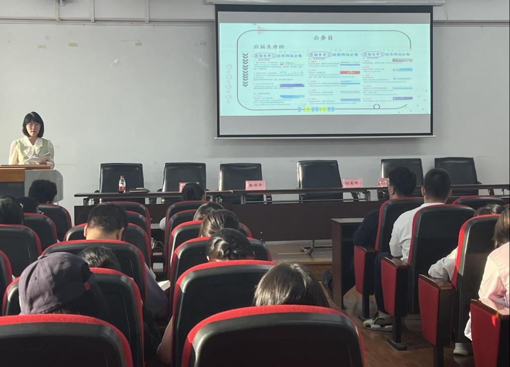 焦老师指出大三是明确方向、梦想启航的关键一年,2021级辅导员焦老师从就业方向进行指导,并从各个就业方向如何获取信息、需要具备的基本条件进行讲解。保研方面,讲解了往届保研的类别、荐标准与实施细则;考研方面,强调要做到信息对称和找准定位,并介绍了要大量搜索信息、搜索学校、考试大纲、报录比、历年真题,精准定位适合自己的专业;基层项目方面,讲解了非定向选调生、三支一扶、特岗教师的招聘流程、基本条件;公务员报考方面,提醒同学们抓住应届生身份,介绍了各省报考网站;协议就业方面,介绍了常用的获取就业信息渠道、线下线上平台。