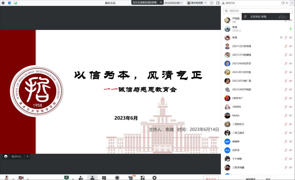 焦老师强调,作为大学生,要自觉做到做到诚信考试、诚信学术、诚信交友、诚信学习。作为社会主义建设者和接班人,要无论在小事情大事情中都坚持做人的道德底线,以诚信铸就人格,让诚信充盈在生活工作学习的方方面面,营造风清气正的班级氛围、校园环境,为社会健康活力发展注入力量。同时,焦老师强调,学会“感恩”,对于现在的同学们来说尤其重要,同学们应该学会对自己所拥有、享受的一切怀有感激之情,只有先懂得感恩,才会懂得关爱和回报。相信同学们会用自己的行动,以真才实学,去报答父母、报答师长、报答社会,报答所有关心爱护和帮助过我们的人,让我们的世界因感恩而更加美好灿烂!