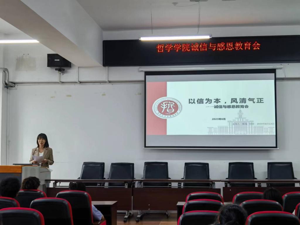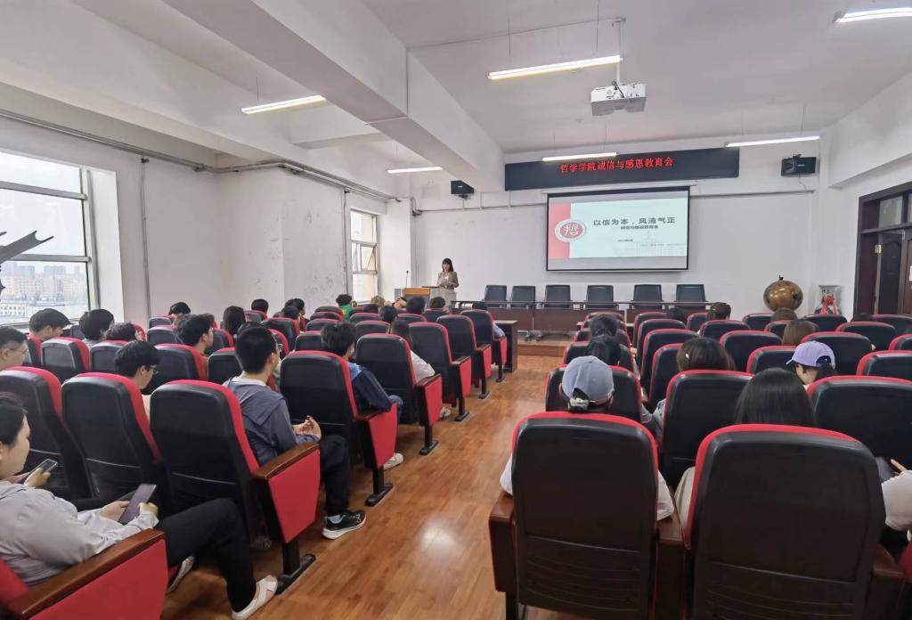 于6月14日-6月15日开展“以信为本,风清气正”诚信感恩教育大会。辅导员焦瑞老师出席并主持此次会议,2021级、2022级全体同学参加大会。