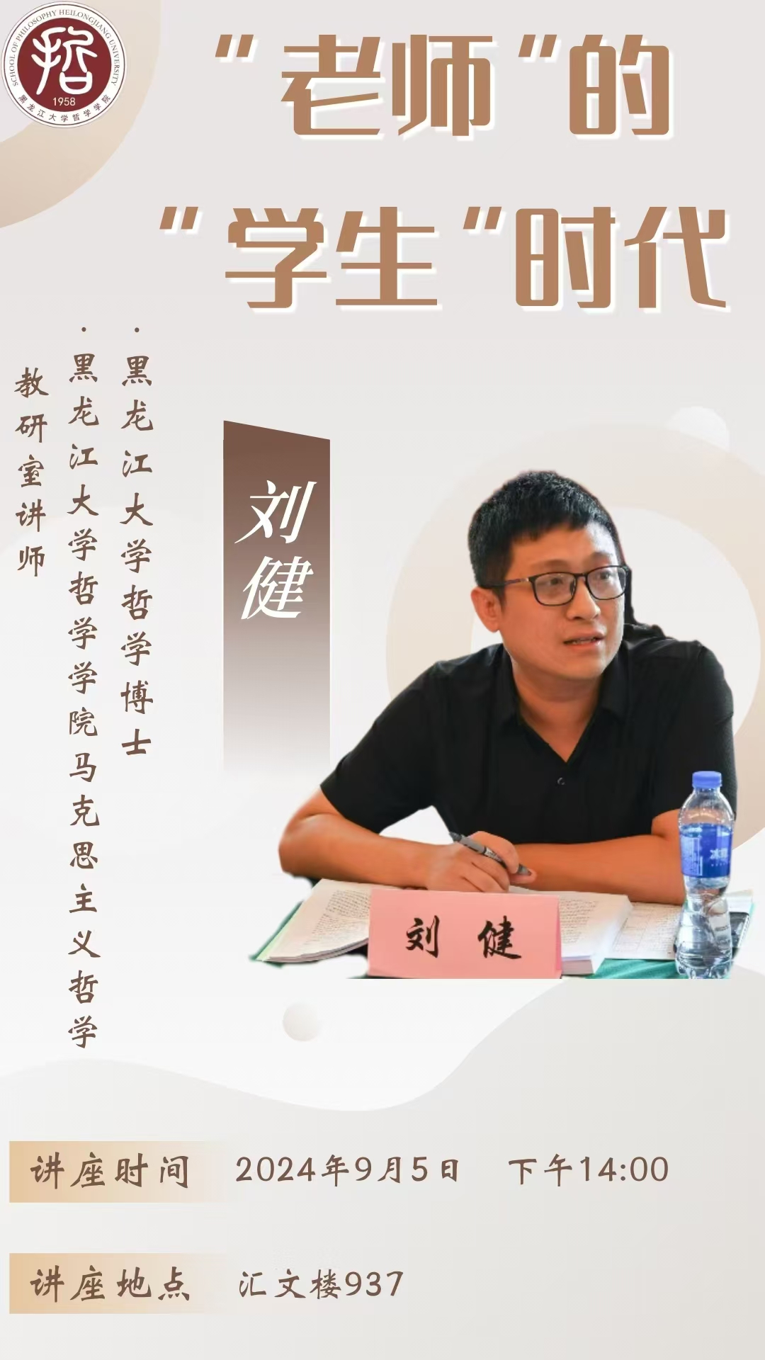 为帮助h韩漫 大一新生更快、更好地适应大学生活,并为他们的职业生涯奠定坚实基础。h韩漫 刘健老师于2024年9月5日在汇文楼937会议室,开展了“哲学与生涯成长”系列主题教育培训之《‘老师’的‘学生’时代”》专题讲座,为新生们开启了一场关于哲学学习与职业规划的智慧之旅。