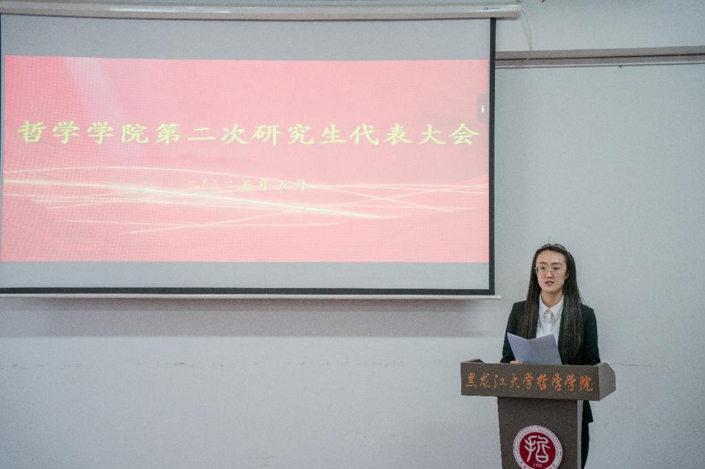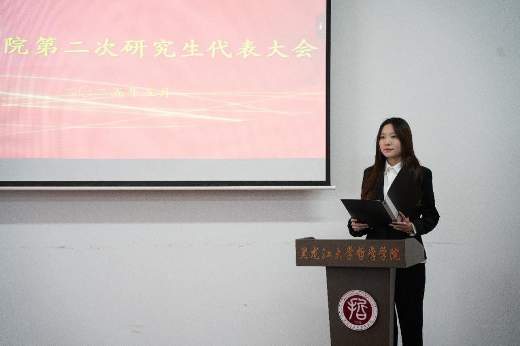 随后,第一届研究生会主席陈诗进行工作报告,她全面总结了学院第一届研究生会在学术交流、文体活动、学生服务、新媒体宣传等方面的工作成果,并对未来工作提出展望。