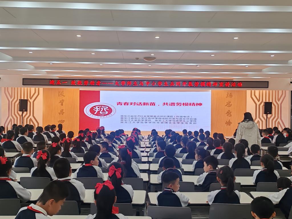 的同学们化身为“红色故事讲解员”,带领小学生们讲述赵一曼、李兆麟革命先烈的事迹,聚焦王进喜、马永顺、马旭等杰出劳模的事迹,引领学生们从革命先烈的绝命诗中读懂“舍生取义”,在劳动模范的俯身躬行中明白“劳动最光荣、劳动最崇高、劳动最伟大、劳动最美丽”的道理。