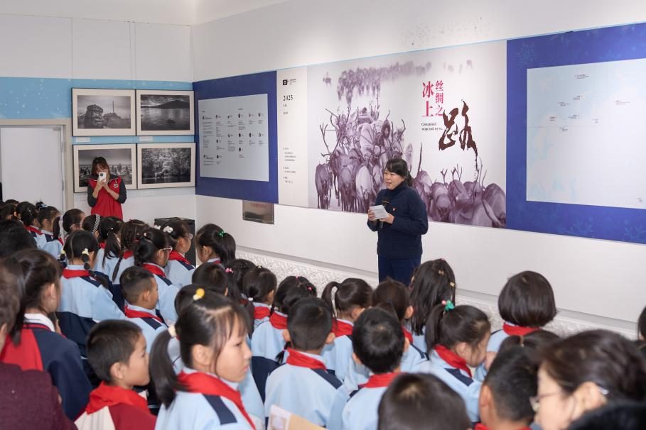 活动从一场跨越时空的讲述开始。在博物馆讲解员的带领下,清滨小学的学生们仔细观看不同年代的冰具、服装与影像,直观地感受着冰雪运动从生产生活演变为竞技文化的历史脉络。