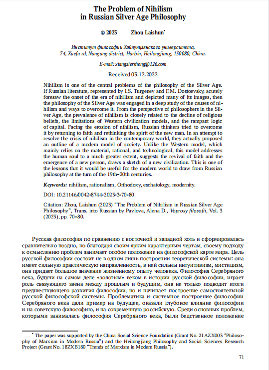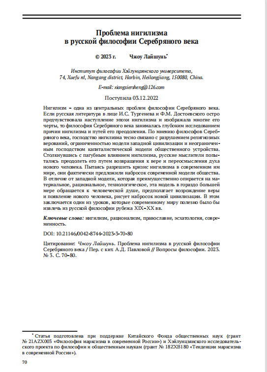 《ВОПРОСЫ ФИЛОСОФИИ》(《哲学问题》)——周来顺《Проблема нигилизма в русской философии Серебряного века》