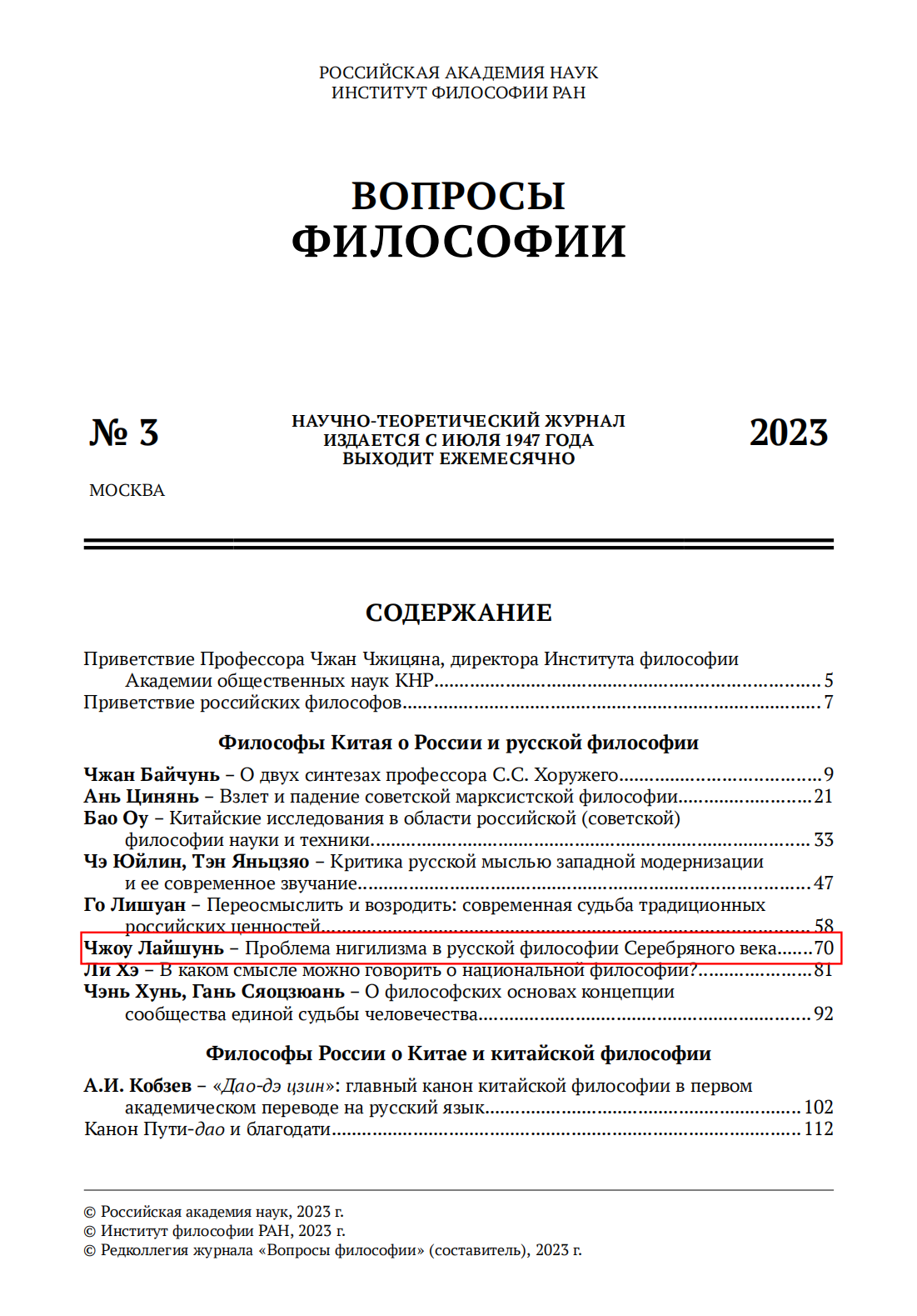 《ВОПРОСЫ ФИЛОСОФИИ》(《哲学问题》)——周来顺《Проблема нигилизма в русской философии Серебряного века》.pdf