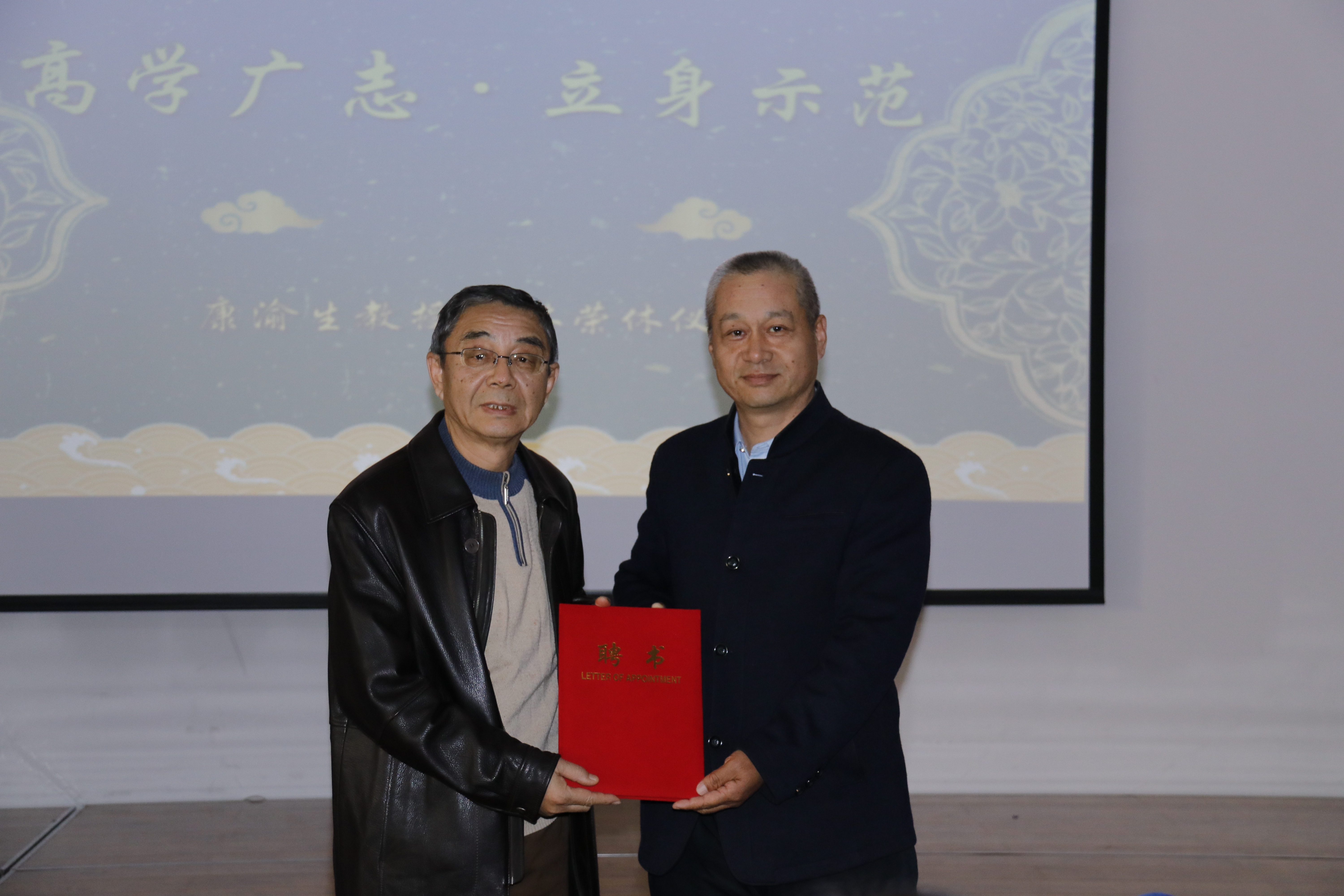 最后,由学校人事处长、马克思主义学院党总支书记王培军向康老师颁发了返聘证书。学校经过研究决定,返聘康渝生教授到马克思主义学院。
