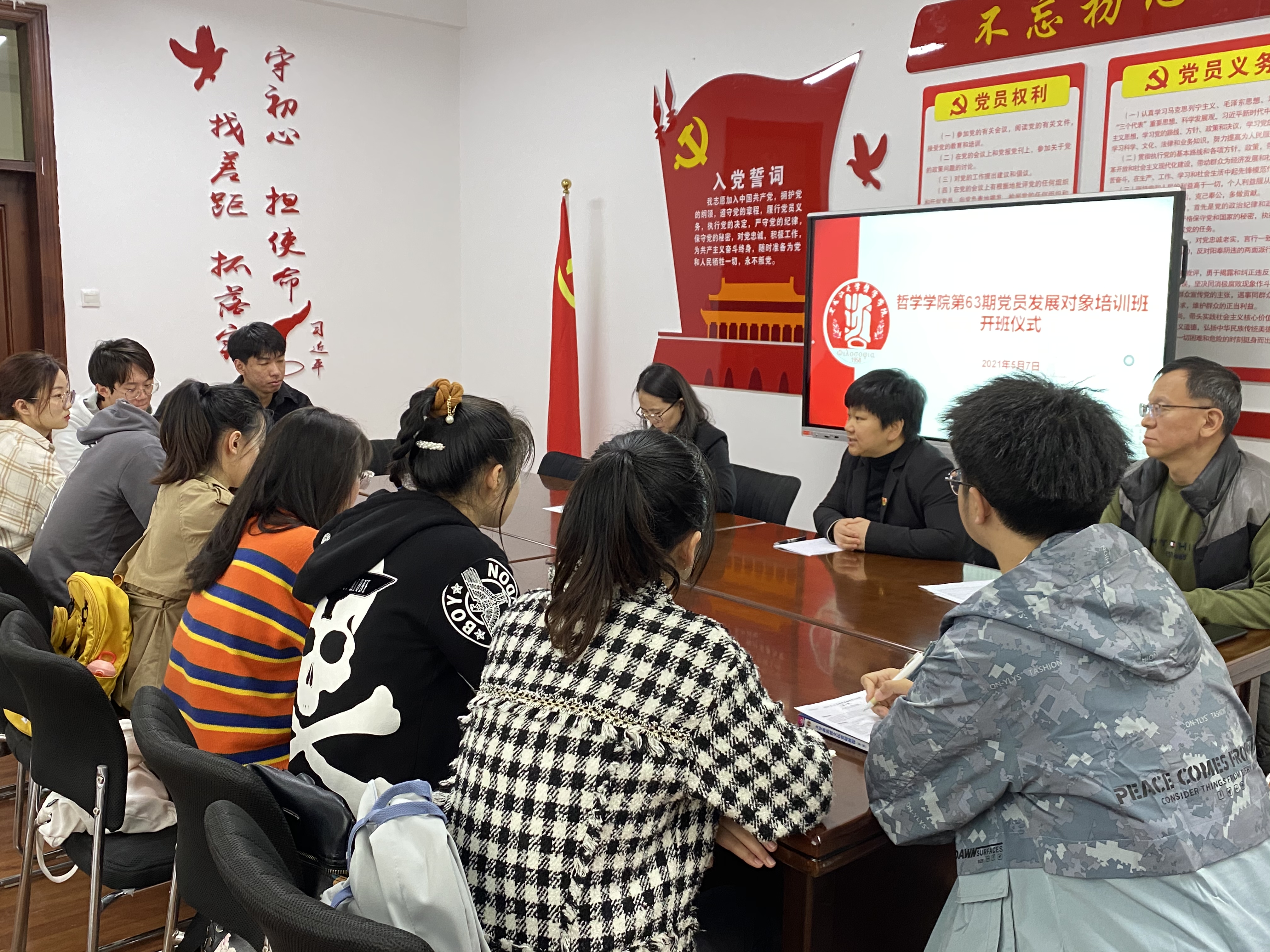 党总支秘书黄影主持,党总支书记孙美晖、正处级辅导员孙庆斌和全体学员参加。