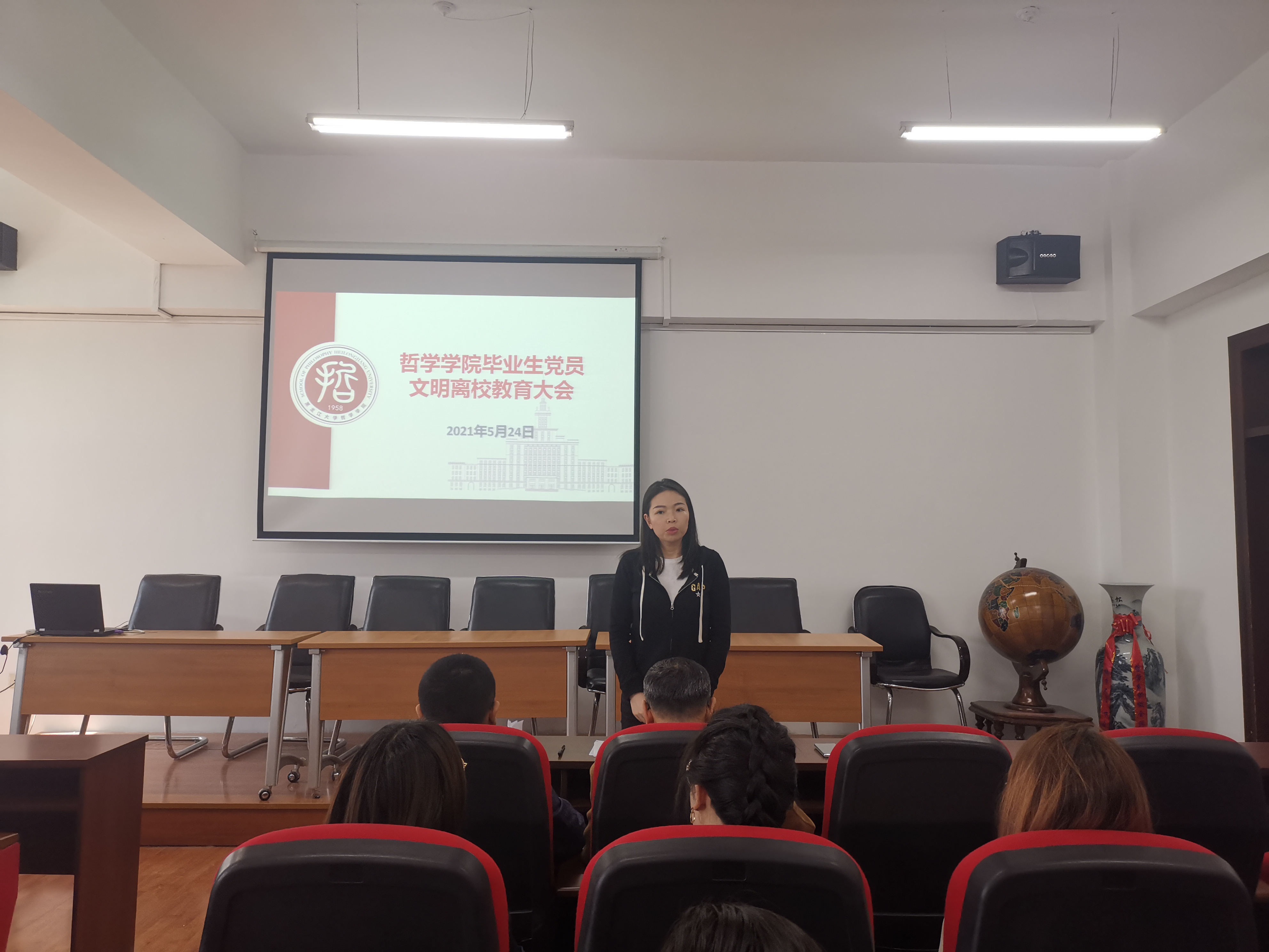 于2021年5月24日在汇文楼937室召开了毕业生党员文明离校教育大会。会议由学院党务秘书黄影主持,学院党总支书记孙美晖、副书记张丽丹、毕业年级辅导员孙庆斌以及全体毕业生党员参加。