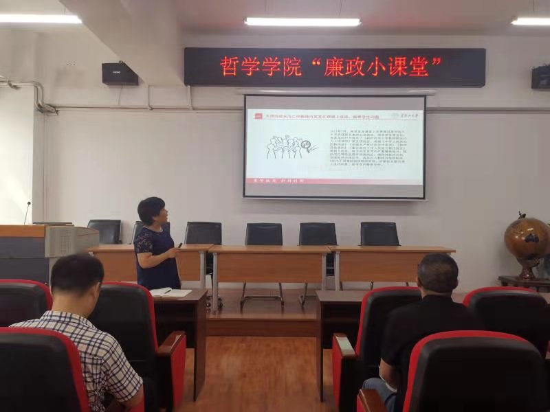 以学院教职工大会为契机,坚持开展每月一次“廉政小课堂”。2021年6月16日15时,学院面向全体教师开展集中学习。