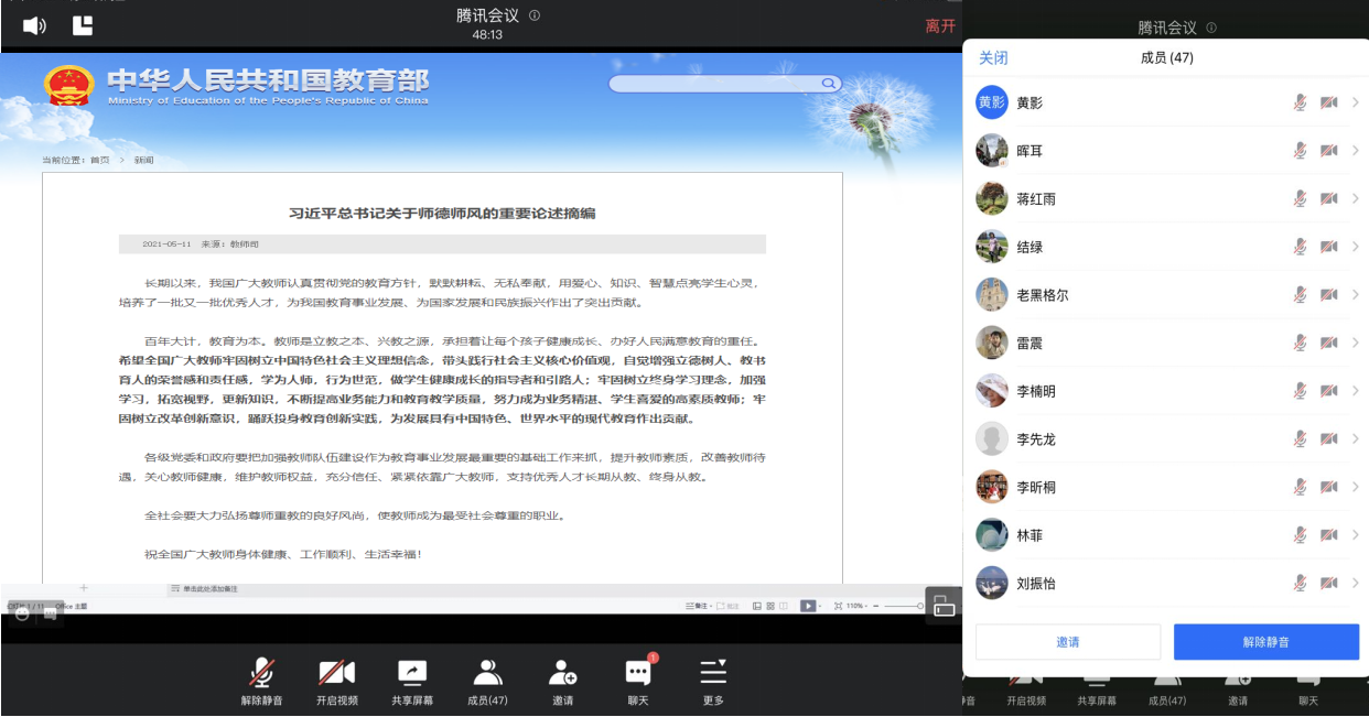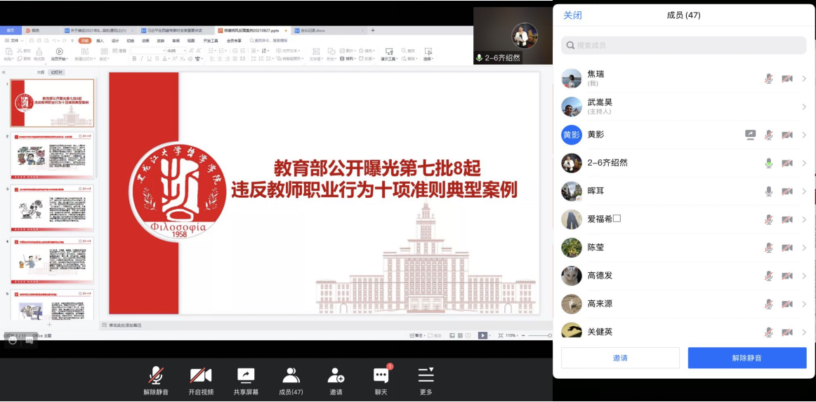 随后,孙美晖书记结合新学期教学工作的相关要求,向全体教师通报了《教育部公开曝光第七批8起违反教师职业行为十项准则典型案例》。要求大家严格遵守学校各项教学管理规定,进一步抓好课堂管理,以案为鉴。以大力推进新文科建设为契机,加强学习,拓宽视野,更新知识,不断提高业务能力和教育教学质量,进一步做好学术规范,成为业务精湛、学生喜爱的高素质教师。