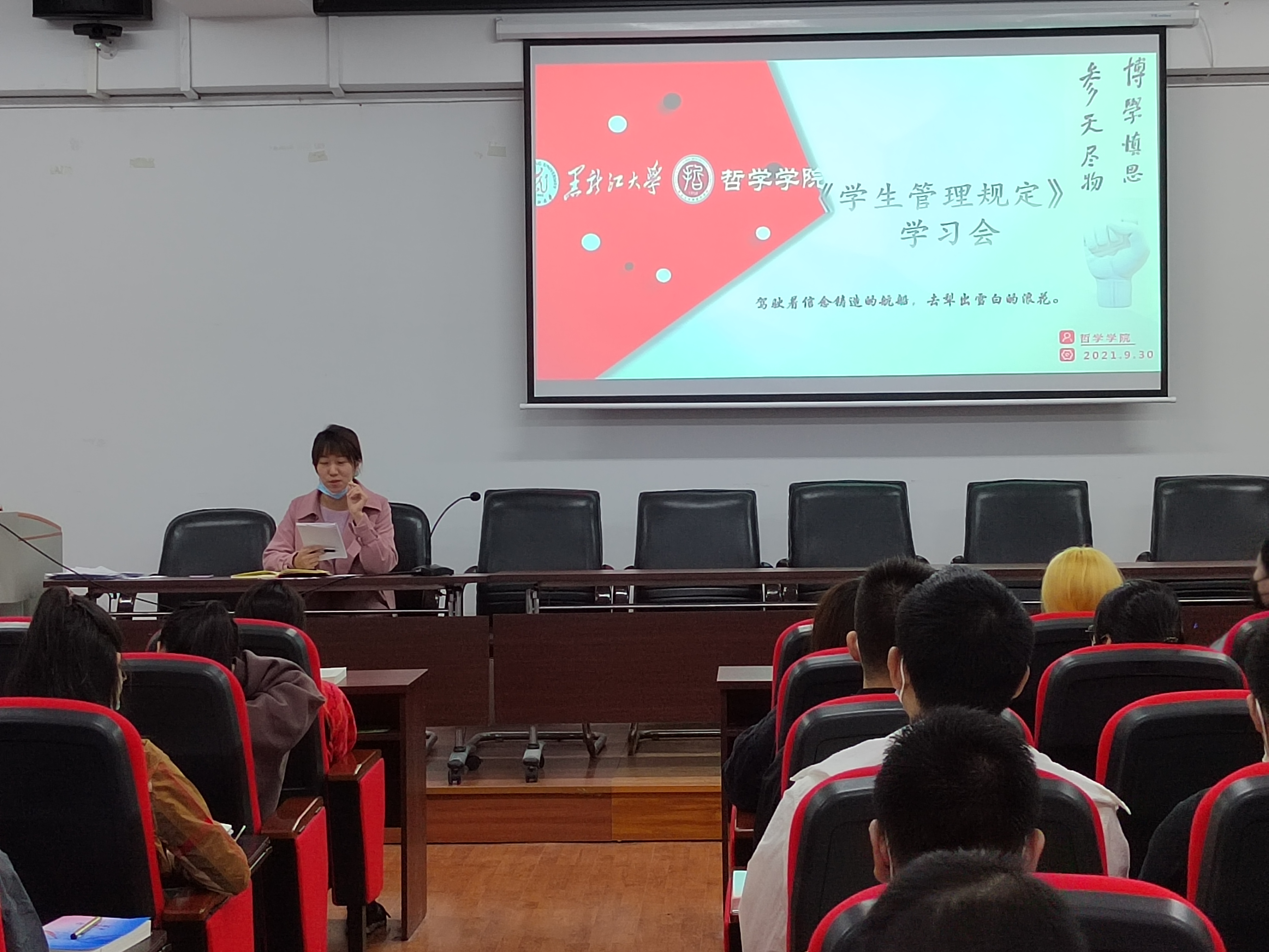 学生管理规定》学习会。新生辅导员焦瑞主持会议,全体哲学学院学生参加会议。