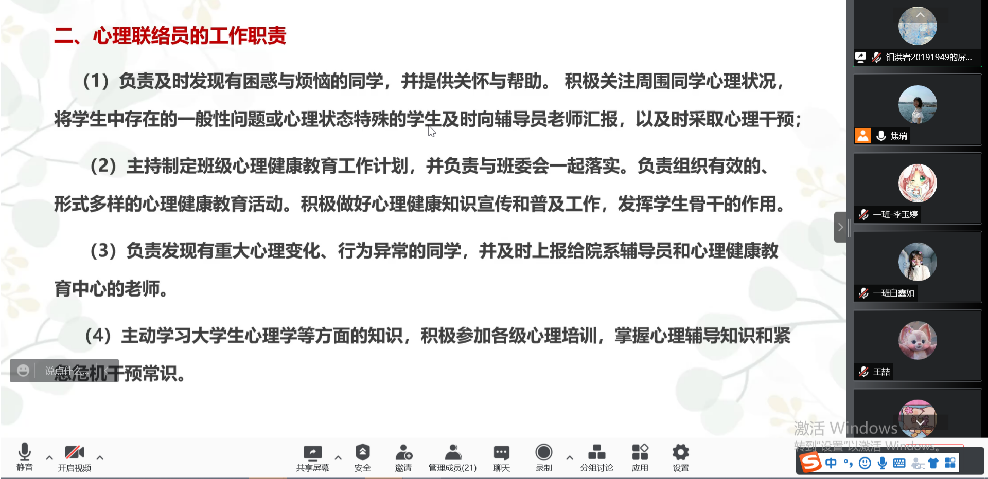 第一部分:介绍了心理联络员的选拔条件。(1)具有较高的思想素质,热心、真诚、乐于助人,愿意关心、帮助同学;(2)对心理学知识感兴趣,并具有较高的工作热情;(3)具有良好的人际沟通能力;(4)学习成绩优良。