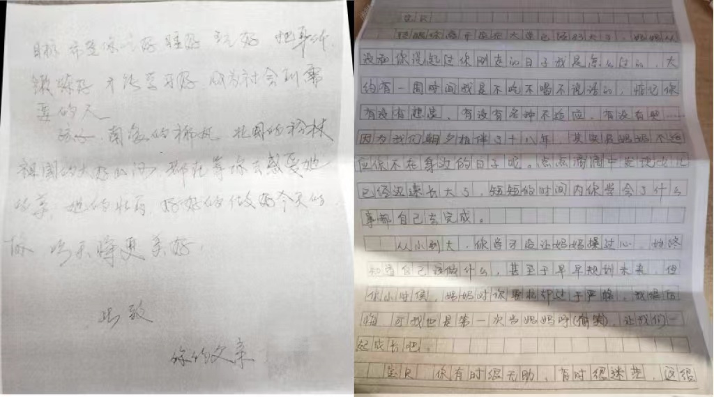2. 吕昕泽:凛冽冬日,思念已至。还没读完信件便已泪流满面,妈妈温柔的笑仿佛就在眼前。我难以想象我走后您一天天的数着日子,以及您在信中寥寥几笔的我最初离开家时您的状态。心疼,思念,各种情绪不断涌出,像要把心填满。但是,如您所说,我在成长,也在为那个可期的未来努力着。最后感谢您遥寄对我的鼓励与思念,也感谢可爱的瑞瑞姐姐将如此特殊的礼物送到我们身边。