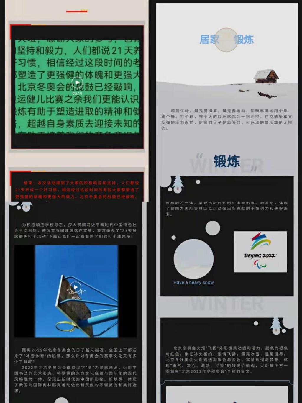 寒假期间,学院决定面对全体同学举行21天居家锻炼打卡的活动,作为14天运动打卡活动的延续,本次活动秉承自愿原则,号召有意愿的同学根据自身情况制定运动计划并扫码进群。本次活动在微信群内进行,通过照片、视频等形式进行每日打卡,以此达到促进身心健康发展的目的。本次活动获得了同学们的广泛响应,取得圆满成功,人们都说21天养成一个好习惯,相信经过这段时间的考验大家都塑造了更强健的体魄和更强大的毅力,体育锻炼有助于塑造进取的精神和健全的人格,超越自身素质去迎接未知的挑战,更有助于培养我们的竞争意识与合作意识。也相信强健的体魄能使同学们在今后的学习、工作生活中更加进步!