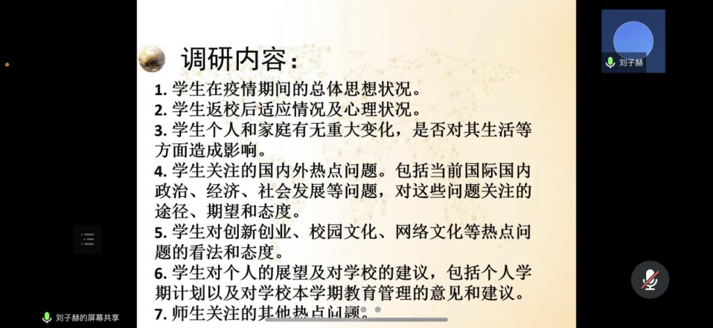积极响应学校学生工作部的号召,于3月18日至21日,分年级分层次召开线上学生思想、学习生活调研会,2019级辅导员孙庆斌老师、2018级和2020级辅导员张博伦老师、2021级辅导员焦瑞老师分别主持会议,各年级学生干部、学生党员、入党积极分子及学生代表参加会议。