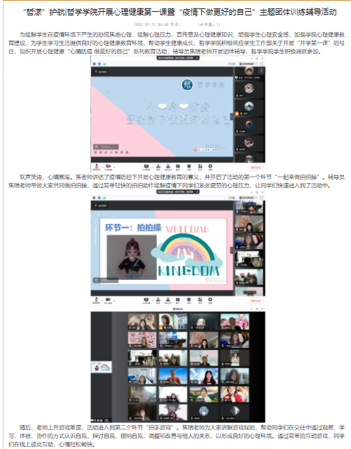 脉脉清风润心灵,心晴氛暖释压力。为缓解学生在疫情环境下产生的恐慌焦虑心理,缓解心理压力,宣传普及心理健康知识,增强学生心理安全感,加强学院心理健康教育建设,为学生学习生活提供良好的心理健康教育环境,帮助学生健康成长,学院积极响应学生工作部关于开展“开学第一课”的号召,组织开展心理健康“心晴防疫 做最好的自己”主题团体辅导,辅导员焦瑞老师开展团体辅导,h韩漫