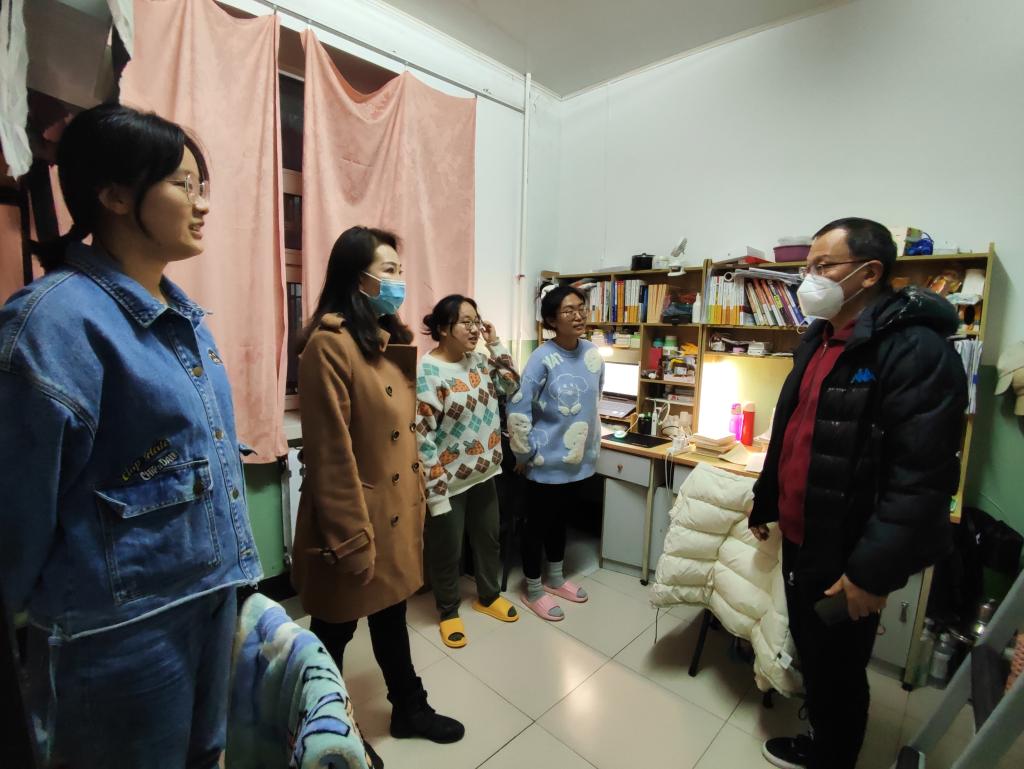 党总支副书记张丽丹、2019级辅导员孙庆斌、2018级、2020级辅导员张博伦和2021级辅导员焦瑞走进各年级学生寝室,为同学们送去疫情管理期间的关心与问候。