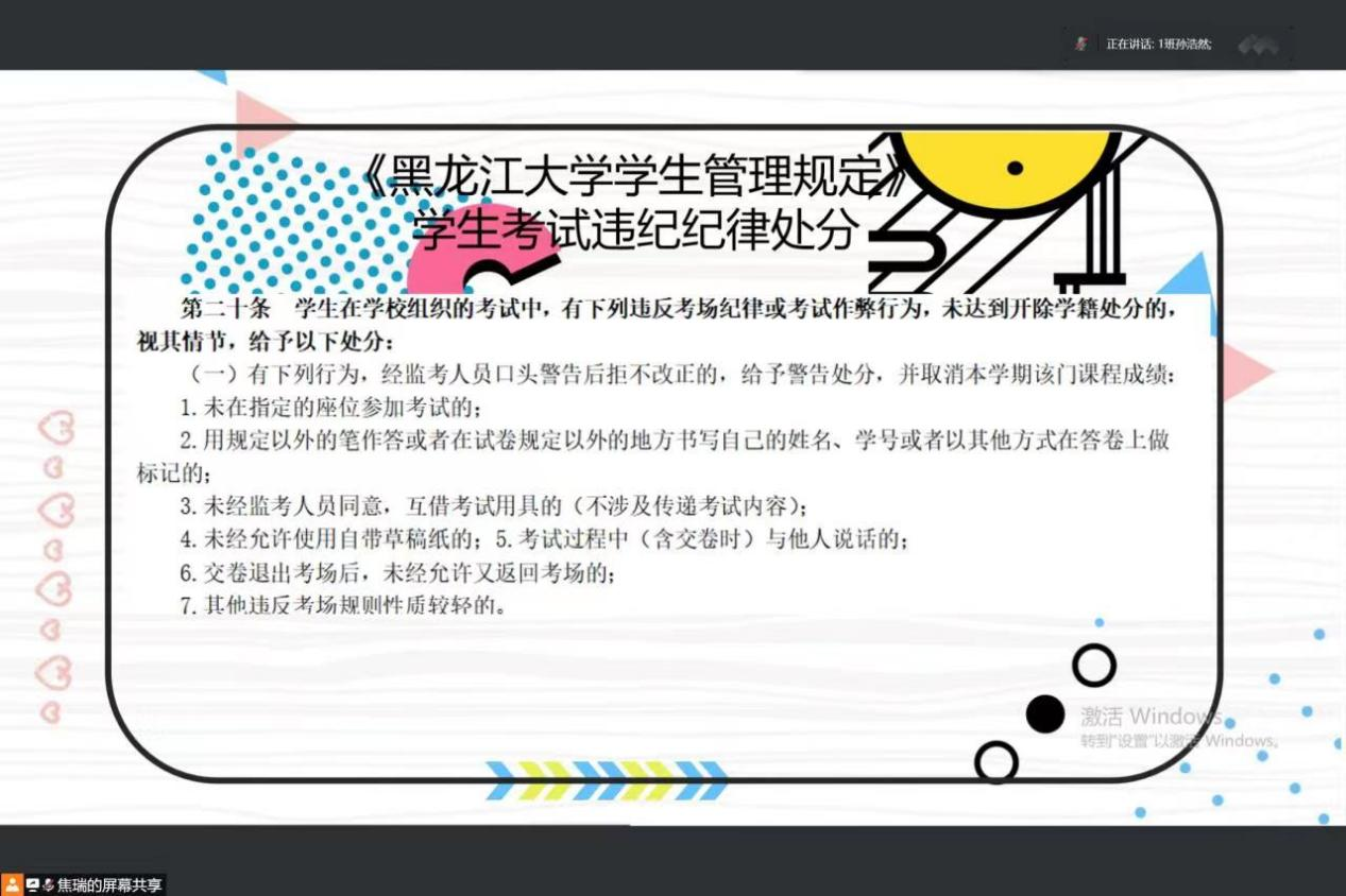 学生管理规定》,明确校规校级的严肃性,作弊不但达不到期望结果,还会受到校规校级的严肃处理,最后,焦老师倡导大家共同营造公平竞争环境,秉持诚信的道德原则。
