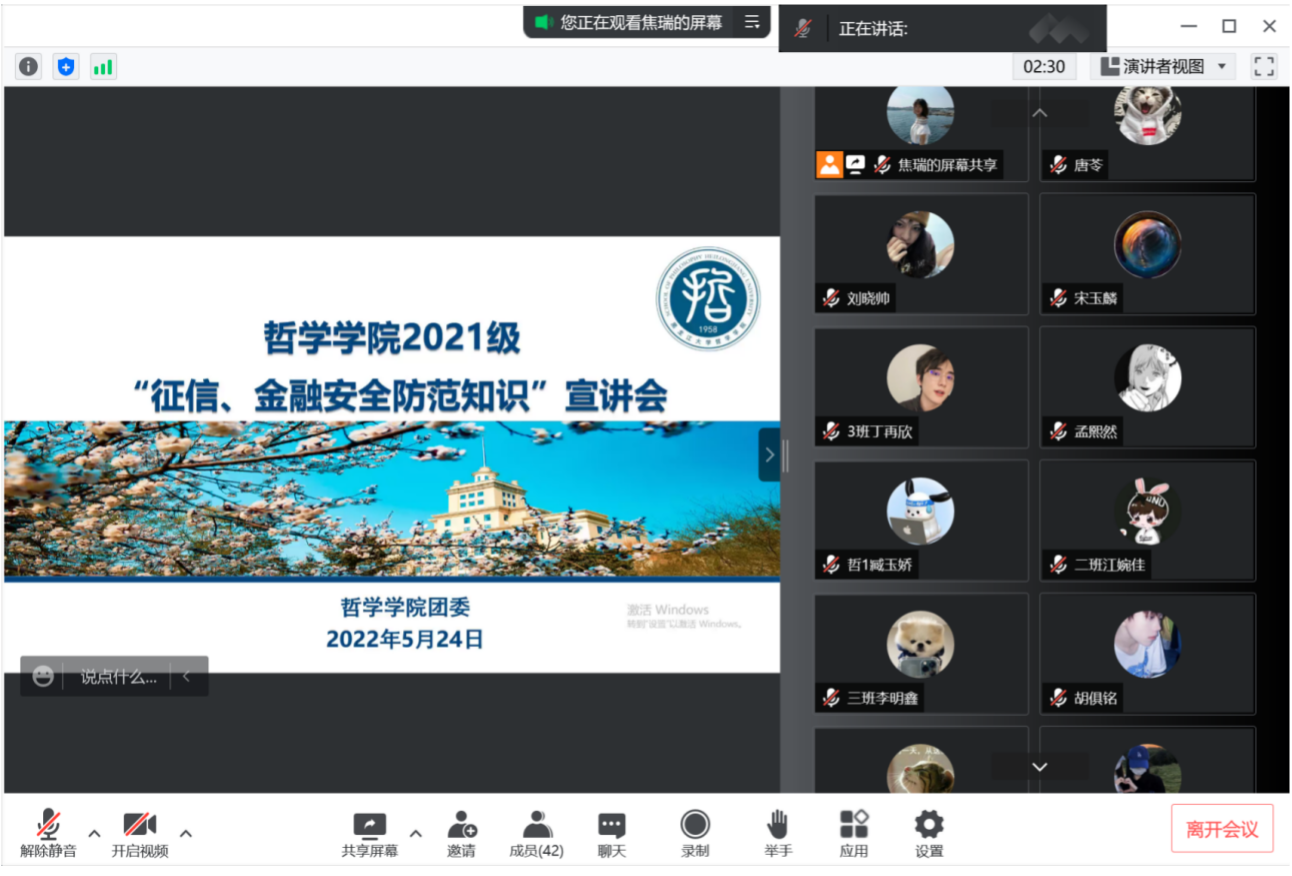 为了开展征信知识、金融知识普及教育,普及预防金融诈骗、电信诈骗和违法高利贷等方面的知识,切实提高大学生征信意识、金融安全防范意识, 使学生充分认识到诚实守信、理性消费的必要性和重要性,引导学生树立诚实守信的价值观和科学理性的消费观。2022年5月25日下午2时,h韩漫