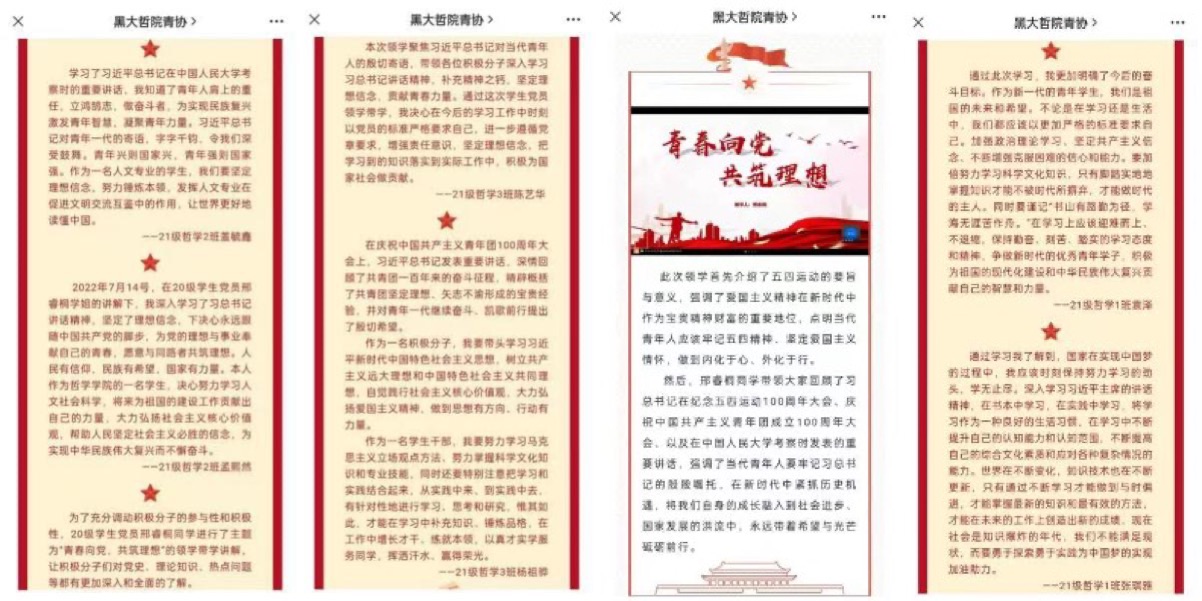 学生工作公众号平台对活动开展及成果进行推广与宣传,有效提高了同学们的自身能动性,使同学们在有限的活动中认识到了青春力量的饱满,决心持续输出鲜活力量,坚定不移听党话、矢志不渝跟党走,以实际行动迎接党的二十大胜利召开!