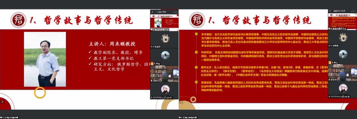 周来顺老师以《哲学故事与哲学传统》为主题, 以“哲学系是包容的、有温度的、哲学的、有未来的”为核心展开讲解。周老师以自身求学经历为例,因为不太了解专业所学内容最初报考不是哲学专业,因本科期间很多课程都是和哲学专业一起上,使他对哲学产生了极大的兴趣,哲学专业的教师对他的欢迎和哲学系包容开放的情怀,深深感动了周老师,因此是包容的哲学系;在周老师从校园走进社会遇到困难时,哲学系的老师都伸出援手,帮助周老师渡过难关,让周老师感受到哲学系的人文情怀,因此是有温度的哲学系;h韩漫