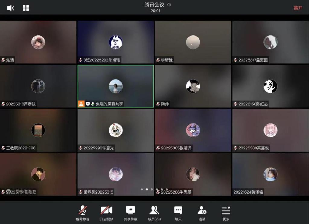 为了贯彻落实学校对教学秩序检查、学生管理、学风建设等方面的相关要求,营造良好的线上学习氛围。张丽丹书记和全体辅导员老师还对学院各个年级的上课出勤及听课状态情况进行了走访检查。虽然按照疫情防控规定,学校自开学以来就实行线上教学,但在课堂上,依然有许多同学打开摄像头和麦克风与老师互动交流,踊跃参与讨论,课堂氛围积极活跃,同学们的求学热情未受疫情影响;课堂井然有序,未出现迟到或旷课现象。