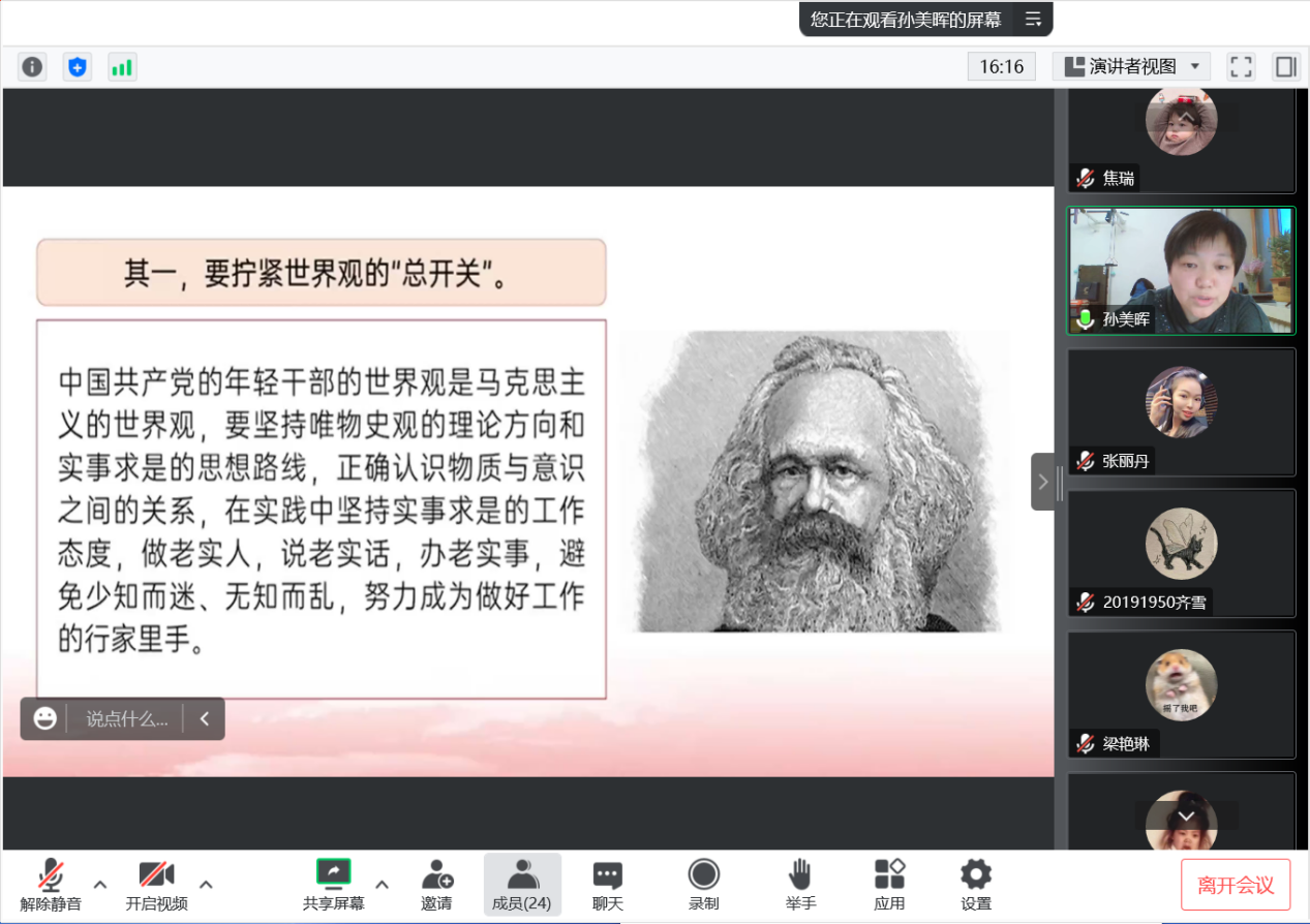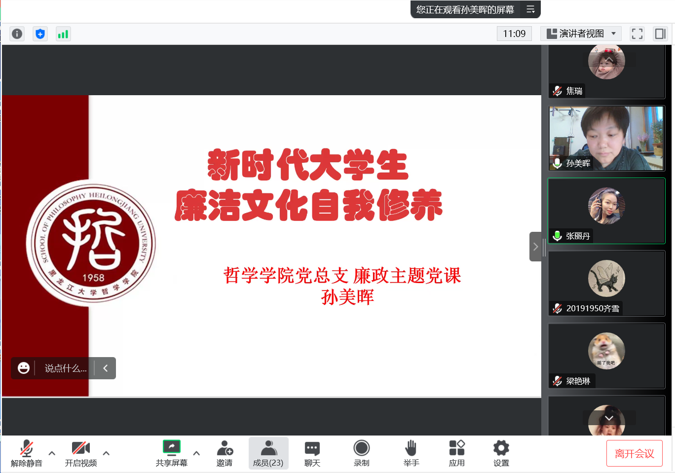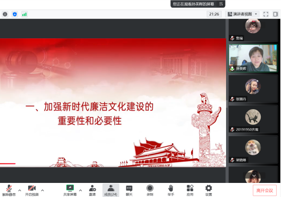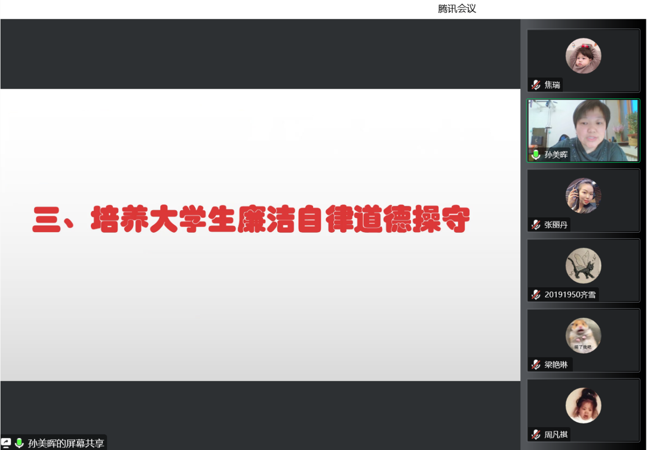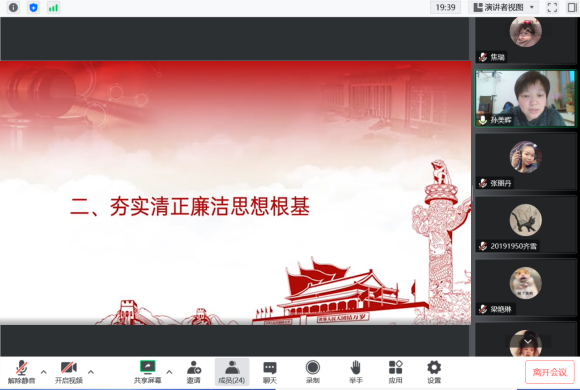 孙美晖书记主讲了主题为“新时代大学生廉洁文化自我修养”的党课,孙书记从文件入手讲解了廉洁教育的重要意义,向各位学生党员介绍了中共中央《关于加强新时代廉洁文化建设的意见》的内容与精神,指出廉洁文化是以廉洁为基本要求,以思想观念、价值取向、行为规范为主要内容,以廉洁政治为目标形成的文化总和,并强调正心修身、涵养文化,才能守住为政之本。
