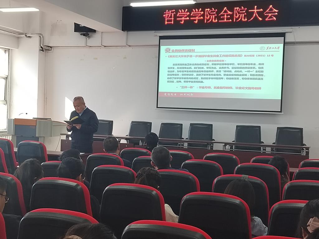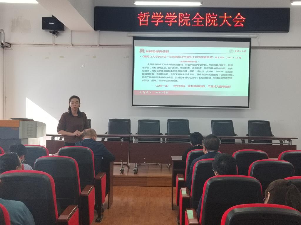院长蒋红雨强调就业工作始终是学院工作的重点,要充分认识到做好毕业生就业工作是一项重要政治任务,结合学科平台、专业优势,从毕业生实际特点和需要出发,促进提升哲学专业毕业生综合素质与竞争力,扎实落实好就业工作全员包保责任制,形成学院上下全体教师高度重视就业工作的新局面。