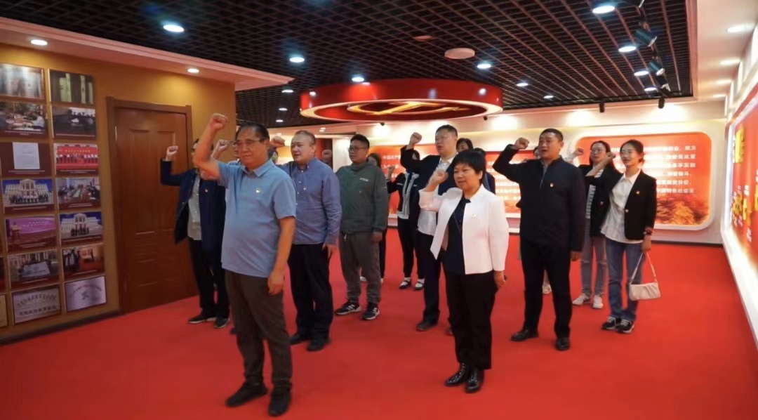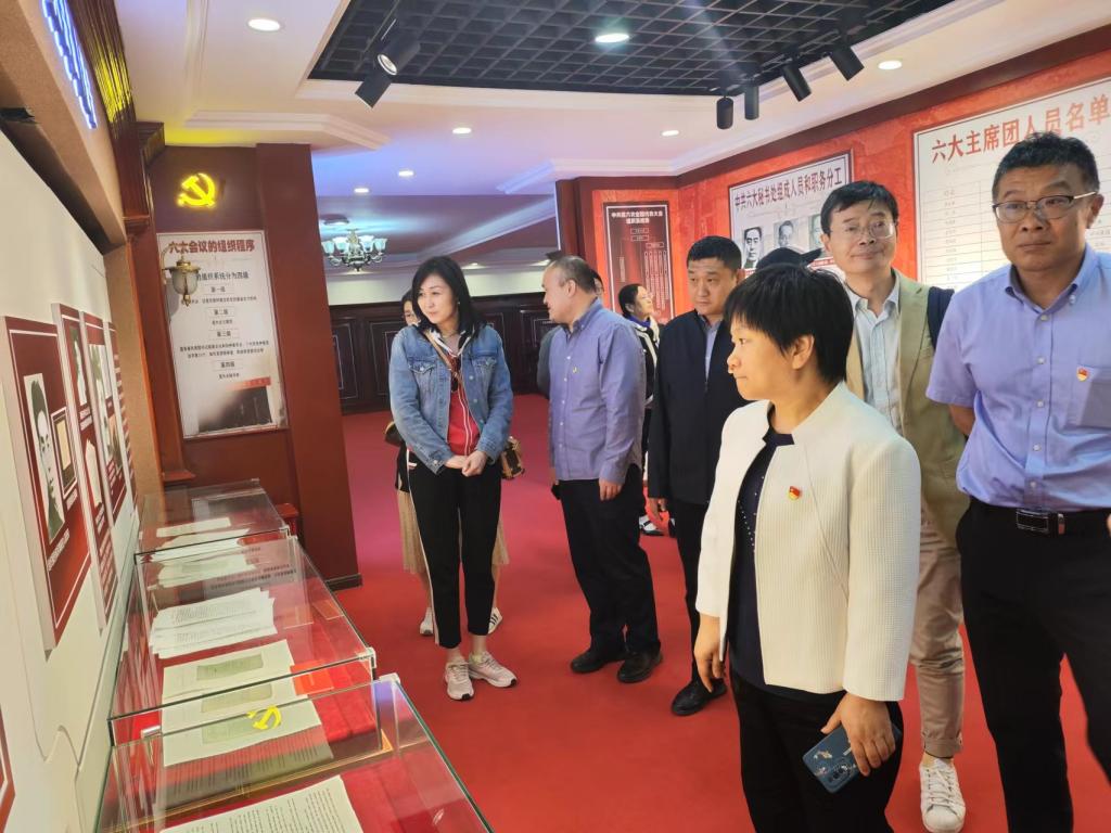 首先,教师们参观了中共六大历史资料陈列馆。该馆以详实的史料、生动的展示,全面介绍了中共六大这一重要会议的历史背景、主要内容及其重大历史意义。通过参观,支部成员深刻领会到中共六大在党的历史上的重要地位,以及这次会议对中国革命道路的深远影响。其中,党龄最长的柴文华教授在陈列馆里庄严领誓,带领参与研学的教师党员们一同重温入党誓词,坚定了理想信念,增强了为党和人民事业奋斗终身的决心和信心。