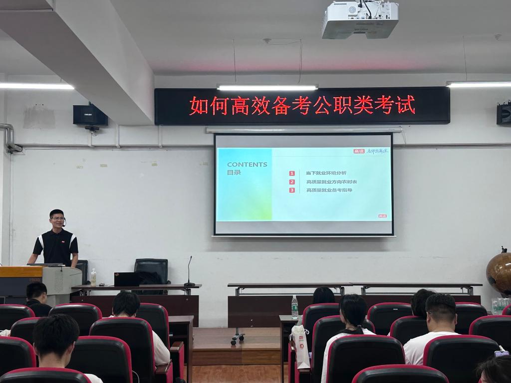 于2024年6月19日在汇文楼937教室开展“如何高效备考公职类考试”讲座,旨在加强政策解读和宣传引导,引导广大青年学生树立正确的就业观念,帮助大学生更好地了解公职类考试,规划自己的职业生涯,为实现高质量就业贡献力量。