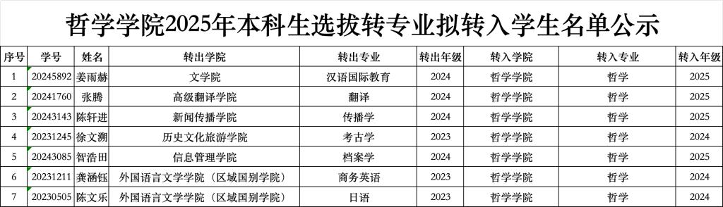 根据《h韩漫 学生管理规定》《h韩漫 普通本科生转专业管理办法(试行)》和h韩漫 转专业2025年本科生选拔转专业工作方案相关要求,经学生申请,学院转专业工作小组考核,现将h韩漫 2025年本科生选拔转专业拟转入学生名单公示如下: