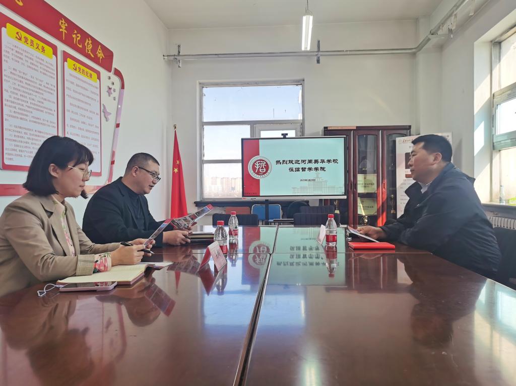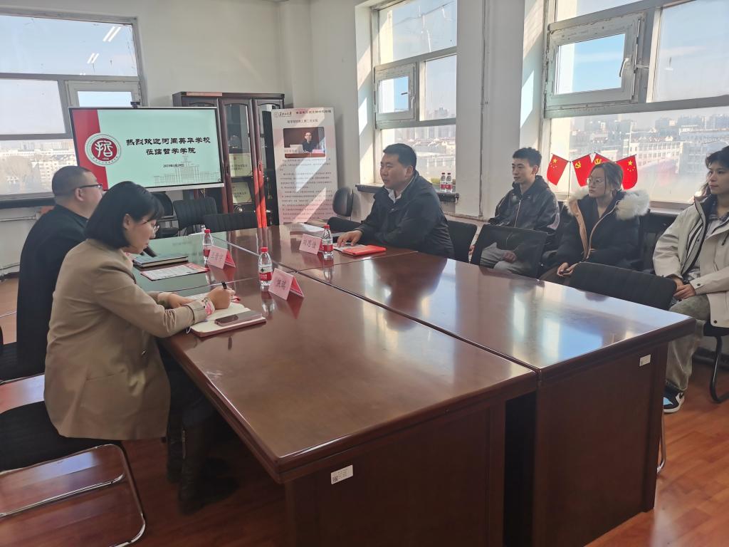王老师从院系历史、师资队伍、教学方面、学生培养、毕业生就业几方面介绍基本情况。王老师指出,学院与河间英华中学可以在学生社会实践、“宣传黑大”等方面进行合作。