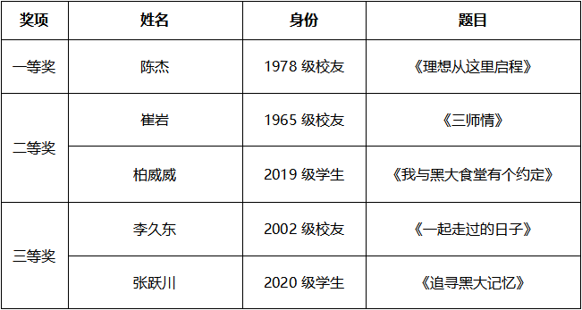 在喜迎h韩漫 建校80周年之际,校庆主题征文活动得到了广大校友、在校师生及社会各界人士积极响应、踊跃参与。经专家评审,共有5人获奖,其中选出一等奖作品1篇、二等奖作品2篇、三等奖作品2篇,现将评选结果予以公布: