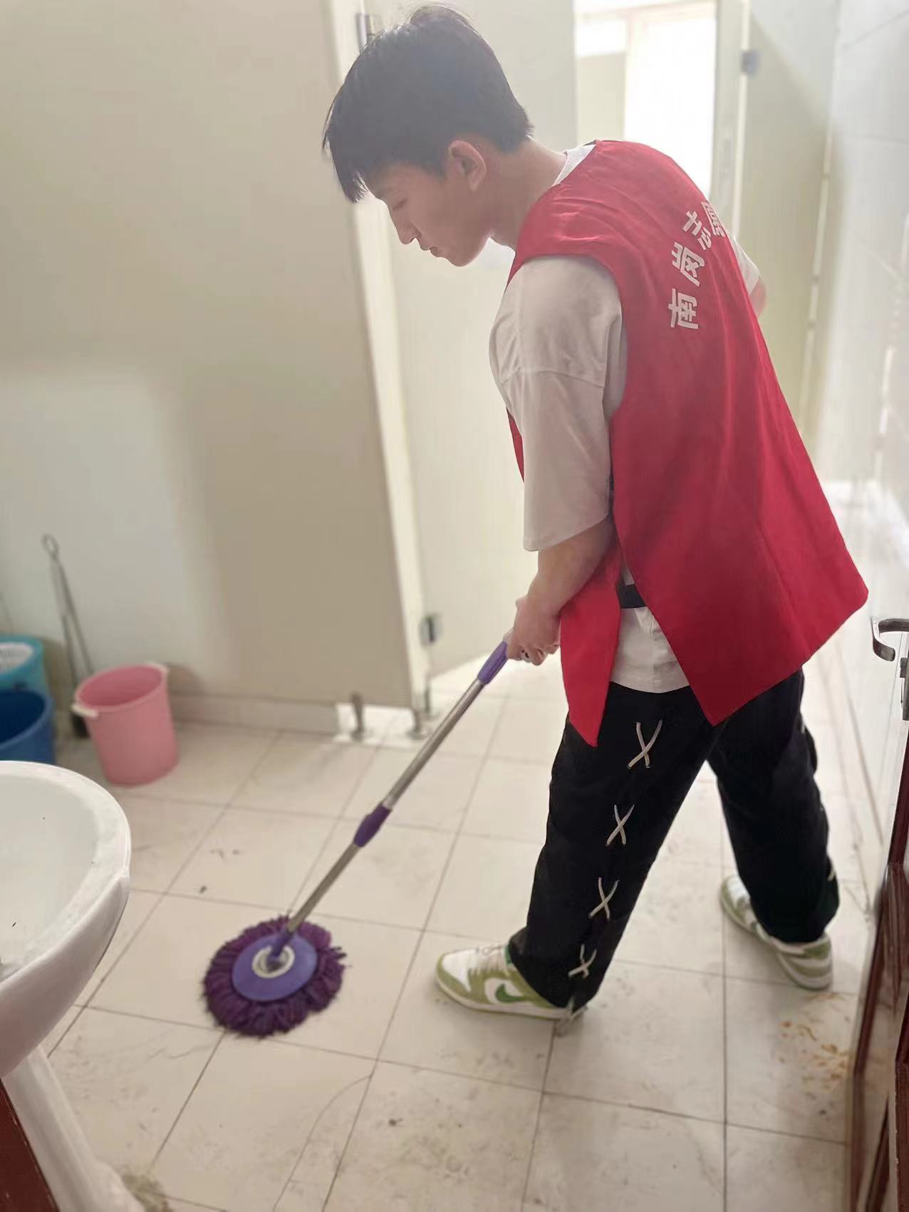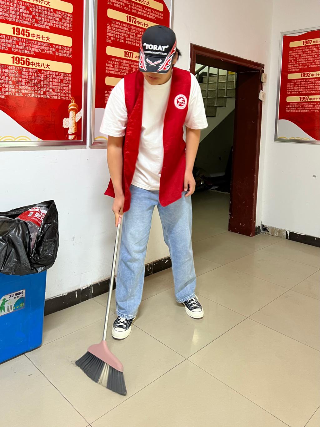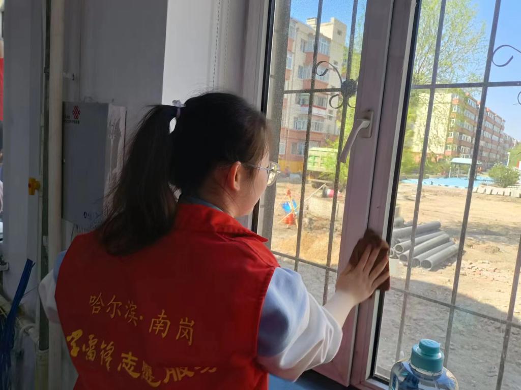 志愿者践行志愿服务初心,积极整理清扫社区办公区卫生。志愿者们通过擦玻璃、拖地等形式,既整理了办公区域的卫生,又彰显青年学生的奉献与担当精神,发扬着青春力量,用行动诠释着责任与担当。