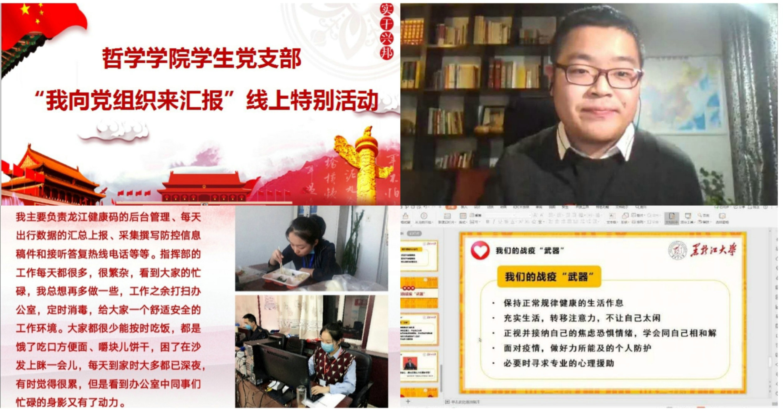 结合学生党员实际和工作重点,于2020年3月13日举办了学生党员“我向党组织来汇报”线上特别活动。活动紧紧围绕“引导学生党员充分发挥先锋模范作用,用实际行动为党旗增辉、为党徽添彩,让党旗在防控疫情斗争中高高飘扬”的主旨内容开展。学生党员代表分别从“投身疫情防控一线志愿服务、线上学习经验与方法分享、居家学习生活节奏及心理调试、融入学院线上文体活动心得分享”等方面,结合自身实际与经历感悟,与学院全体学生党员进行深入交流。大家相互学习,汲取经验,共同提高。学生党员真切表达出在特殊时期的庄重承诺,体现出严以律己的责任担当,彰显出“抗击疫情,义不容辞”的青年榜样力量!努力发挥自身作用,坚定战胜疫情信心,以实际行动传递正能量,为打赢战“疫”阻击战贡献出应有之力。